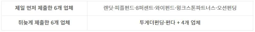 참고로 정식 업체로 등록하기 위한 신청서를 제출한 업체는 이렇다. (2021년 4-5월 경에 신청서를 제출한 6개 업체 중 투게더펀딩과 펀다가 아닌 다른 4개 업체가 어디인지는 기사를 통해서는 확인하기 어렵다.)
