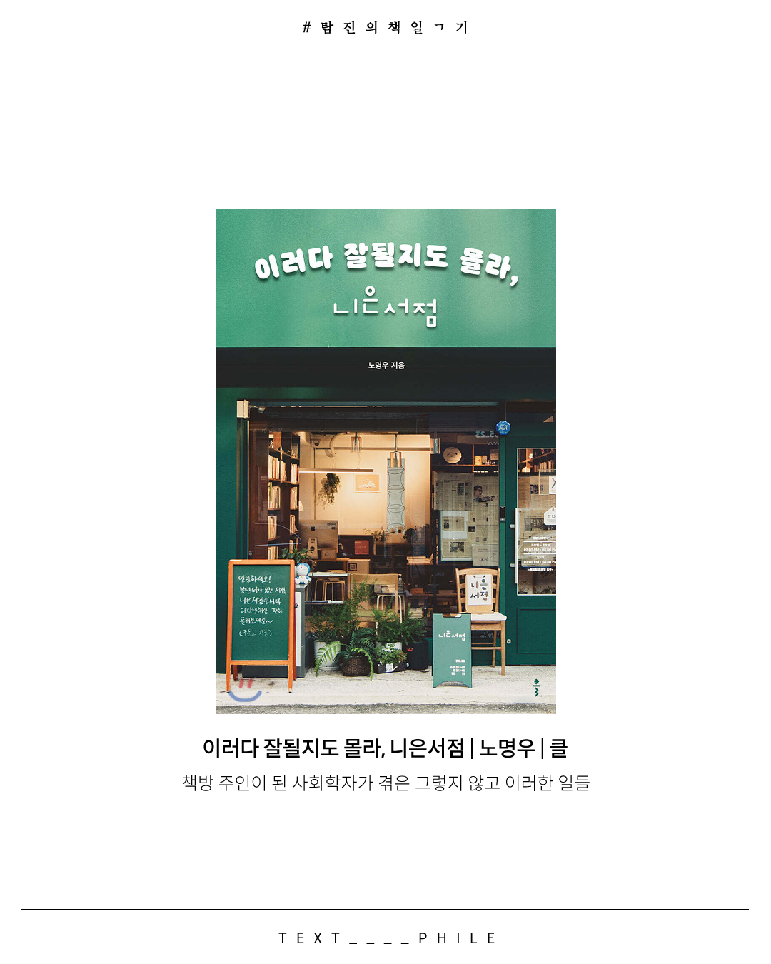 클 출판사에는 노명우 작가님의 서점에세이가 있습니다. 『이러다 잘 될지도 몰라, 니은서점』가 바로 그 책이에요. 작가에 관심이 생기니 읽어보고 싶어 졌고, 읽고 나니 가보고 싶어 졌습니다. 그렇게 '니은서점'은 꼭 가보겠다고 마음먹게 되었죠.