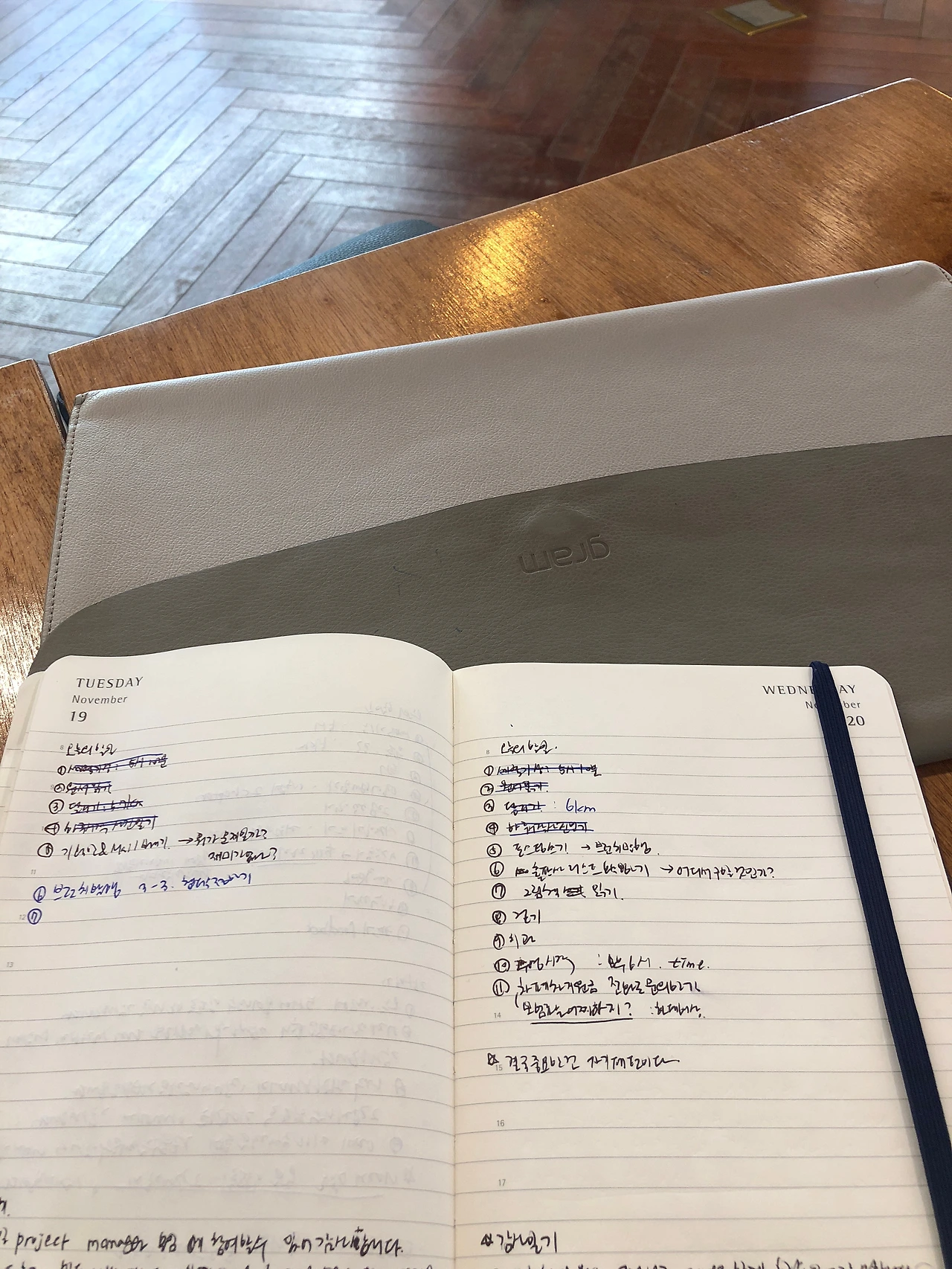 서울로 돌아오자마자 아침에 일찍 일어나는 습관부터 다시 바로 잡았다. 그동안 30분, 1시간씩 미뤄서 늦잠을 자던 패턴을 다시 5시로 맞췄다. 그리고 매일 해야 할 일을 수첩에 빼곡히 적기 시작했다. 두 달 넘게 여유를 부린다며 수첩도 제대로 관리하지 않았다. 수첩에 해야 할 일을 빼곡히 적으니 뭔가 많은 일을 한 것 같은 "착각"이 들었다. 그 일을 했든, 안했든 To-do 리스트를 보는 것만으로도 평온해지는 것 같았다. 몸이 힘들어도 끊임없이 뭘 해야 나답다는 사실을 알게 되었다.