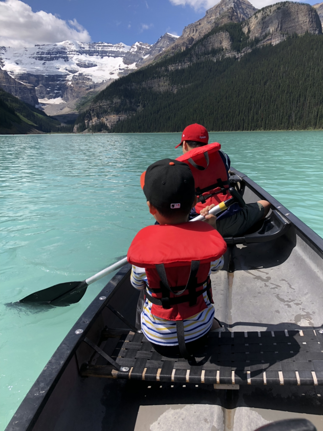 한참동안 멍하니 풍경을 바라본 우리는 조금 더 가까이에서 호수를 느끼고 싶었다. 관광객을 위한 카누를, 아이들과 함께 타보기로 했다. 기다리는 줄도 길었고 값도 꽤 비쌌다. 셋이 한 시간동안 타는데 캐나다 달러로 125달러나 들었다. 십만원도 넘는 금액을 지불하는 게 맞나 잠깐 망설이기도 했지만 눈앞에 펼쳐진 호수를 그냥 지나쳐 갈 수 없었다. 이런 경험을 언제 하냐 싶어 기꺼이 큰 돈을 지불하고 레이크 루이스 한가운데로 빠져 들었다. 카누를 타니 우리가 그림 속에 들어온 느낌이 들었다. 마치 동화 속에 요정으로 변신한 기분이었다. 꿈을 꾸고 있는 듯 했다.