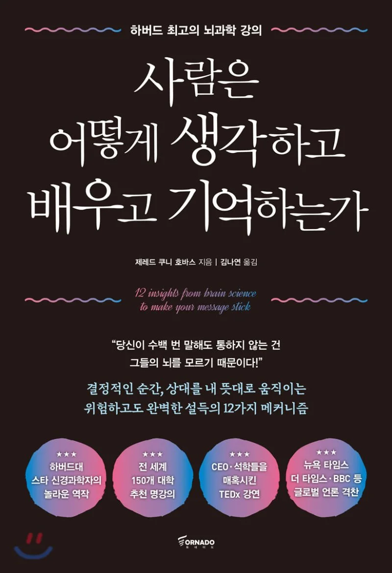 세 번째로 소개할 책은 <사람은 어떻게 생각하고 배우고 기억하는가>입니다. 책은 뇌의 기능과 관련한 12가지 메시지를 전달하는데요. "뇌"라는 다소 무겁고 심오한 주제를 쉽게 설명해서 읽기 편한 책이었어요. 책을 읽으면서 학습을 잘 하기 위해서 인간의 뇌를 어떻게 활용해야 하는지를 이해할 수 있게 됐는데요. 덕분에 저는 발표를 할 때 어떻게 프리젠테이션 자료를 만들고 어떻게 발표를 해야 하는지를 고민할 수 있었어요. 그동안은 그냥 했던 고민이었다면 책을 읽은 후 한 고민은 좀 더 뇌의 원리를 이해하고 하게 된 고민이랄까요?