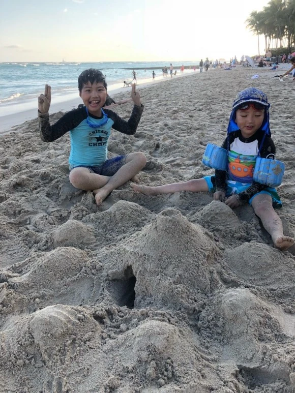 분명 스노클링도 하고 바다에서 실컷 논 아이들이지만 처음 바다에 나온 것마냥 한바탕 신나게 놀았다. 파도에 몸을 맡긴채 바다에서 놀다가 힘들면 모래놀이를 하며 해변에서도 놀았다. 와이키키 해변의 모래도 아이들이 좋아할만큼 고운 모래였다.