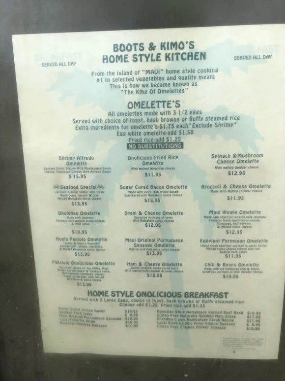 메뉴판과 가격이다. 팬케이크와 오믈릿 그리고 고기류가 주된 메뉴로 보였다. 우리가 시킨 메뉴는 세개였다. 하나는 이곳의 대표 메뉴였다. Banana Pancake with "Kimo's" Macadamia Nut Sauce! 일명 마카다미아 팬케이크로 불리는 메뉴였다. 두번째는 쉬림프 알프레도 오믈릿! 새우와 알프레도 소스가 잘 버무진 오믈릿이었다. 그리고 세번째 메뉴는 아이들이 사랑하는 갈비! 이곳에도 갈비메뉴가 있었다.