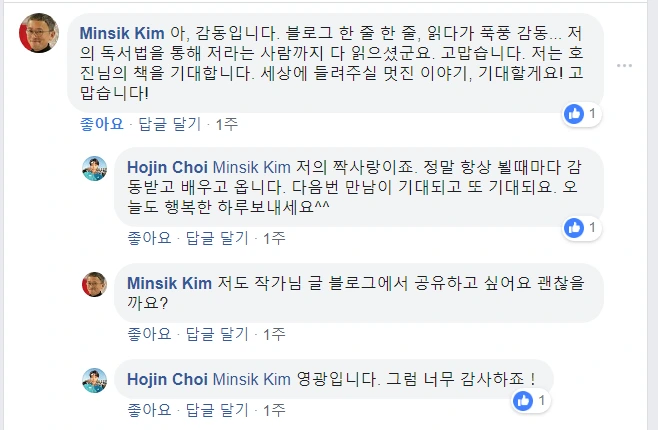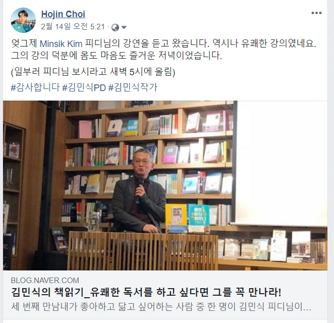 그날의 감동을 놓치지 않기 위해 글을 썼다. 그가 언뜻언뜻 설명한 이야기를 기반으로 그가 책을 읽는 이유를 표현했다. 그리고 그 글을 김민식 피디가 좋아해 줬고 공유까지 해주었다.