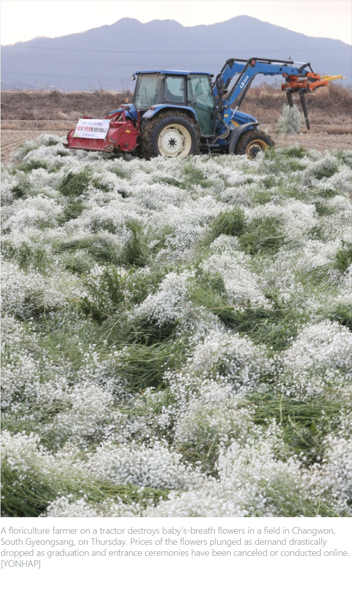 0_영자신문을 보다가 안개꽃을 baby’s breath라고 한다는 것을 처음 알았다. 졸업과 입학 시즌이지만 코로나 바이러스 때문에 수요가 급감하면서 꽃 재배 농부가 트랙터로 안개꽃을 갈아엎는 사진이 큼지막하게 실려 있었다.