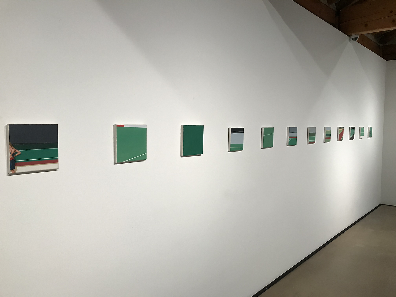 학고재 갤러리에 걸린 팀 아이텔의 그림은 두 점. 그 중 눈에 띈 것은 열두 개의 작은 캔버스가 나란히 놓인 <스타디온(아레나)>(2001)이다. 각 캔버스에 담긴 경기장의 모습은 시간의 분절처럼 느껴진다. 양쪽 끝 캔버스엔 각각 인물 하나가 등장한다. 한쪽 끝엔 짧은 갈색 머리에 검은 옷을 입고 뒷짐을 지고 있는 모습. 또 다른 한쪽 끝엔 금발의 포니테일에 여름옷을 입은 여자의 몸이 반쯤 프레임에 걸쳐져 있다. 프레임 밖으로 퇴장하는 듯한 모습. 두 인물은 다른 인물일 수도, 같은 인물일 수도 있다. 어느 쪽에서 그림을 보느냐에 따라 끝과 시작은 달라진다. 이야기의 방향은 읽는 이에 따라 바뀔 수 있다. 경기장을 바라보는 인물과 경기장을 빠져나가는 인물.
