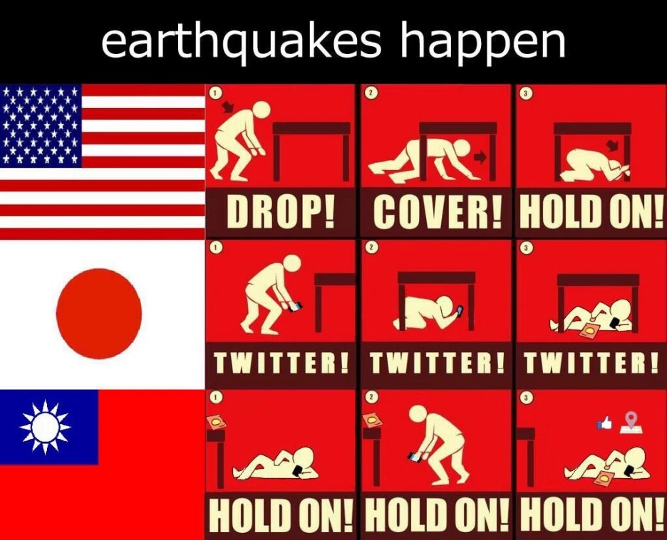 2. 일본: 반사적으로 몸을 숙이는 동시에 핸드폰에 (트위터) 메시지를 남긴다. 테이블 밑에서도 트위터 기록을 남긴다. 과자를 까먹으며 트위터를 한다. (일본 국민의 기록하는 습성? 그리고 지진에 대한 내성.)