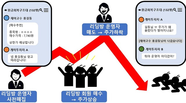 이외에도 리딩방을 통한 사기 수법은 마르고 닳도록 많다. 이런 방법을 반복하고 어느 정도 물고기를 많이 모은 방장은 '규모의 경제'를 실현할 수 있는 커맨더가 되는데, 그때부턴 바로 그 유명한 아래의 메커니즘을 돌릴 수 있게 된다.