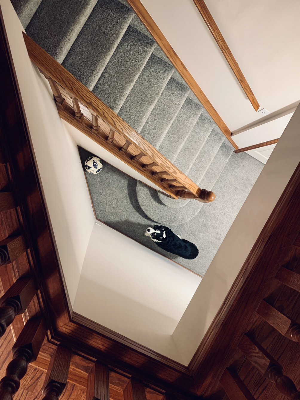 축구 신동이라고 보아도 무방한 우리 집 막내 멜로디랍니다. 그러나 오늘은 영하 20도 가까이 떨어져 밖에 나가지 않고 실내에서 기초 체력 훈련 중. 떼굴떼굴 공을 굴려서 내려 보내 주면 열심히 갖고 올라옵니다. 보통의 날엔 산책도 하루에 두 번 이상 나가야 합니다.
