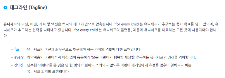 "브랜드의 힘은 시각적인 구성물로부터 나오는 것이 아니라 그 브랜드의 어필과 브랜드에서 주창하는 가치에 대한 호소력에서 나옵니다. 유니세프 브랜드의 힘은 더 좋은 세상을 구축하고자 하는 비전에 있으며 이러한 비전을 실현하는 역량에 있습니다."(감동적이다..)