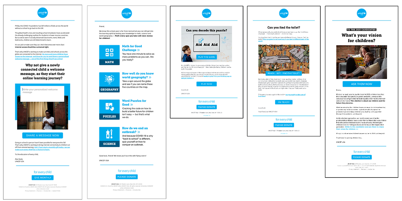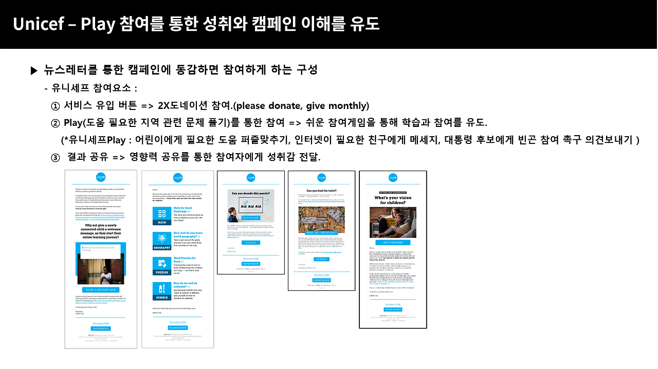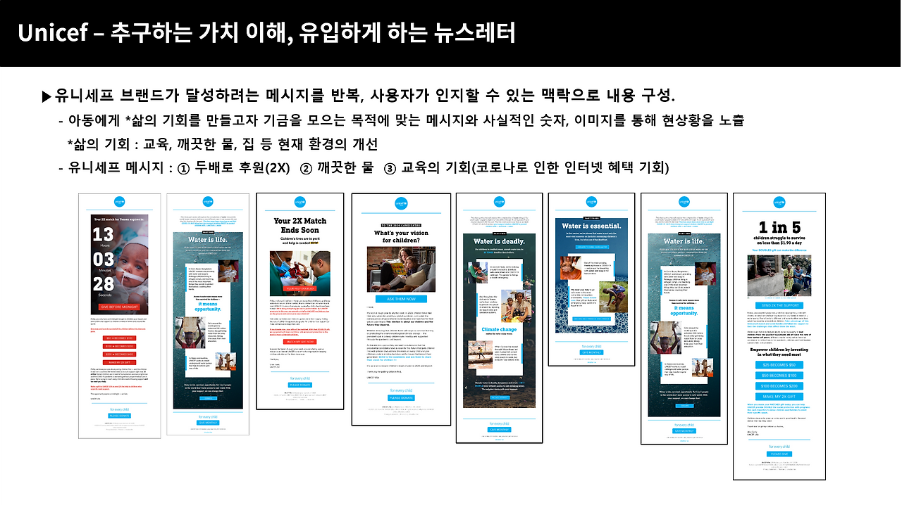 상품이나 서비스를 소비하는 브랜드와 달리, 유니세프 같은 단체는 행동을 이끌어 내는 것이 브랜드를 소비하는 참여하는 것과 같다.(개인적으로 일반적인 브랜드도 이래야 한다고 생각한다.) 호소의 과정을 실현하는 여러 매체 중 뉴스레터에 어떻게 담고 있는지 메시지와 콘텐츠, 레터 사이클을 통해 살펴보았다.