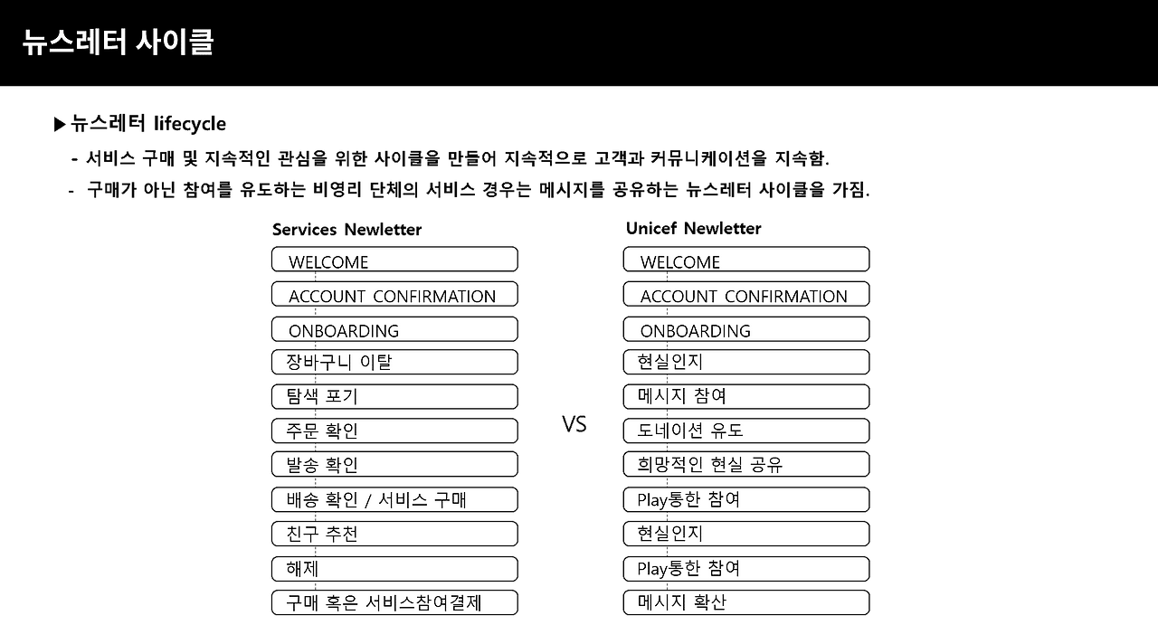 일반적으로 구매를 목적으로 하는 서비스, 브랜드의 뉴스레터는 바로 구매를 유도하는 과정을 위해 설계되고 만들어진다. 처음에 환영 인사, 계정 확인, 이탈하지 않도록 계속 리마인드 하면서 주문이 일어나면 발송 상태와 배송을 알려준다. 하지만 유니세프가 동의와 참여를 만드는 사이클은 오른쪽과 같이 다른 사이클을 발견 할 수 있었다.
