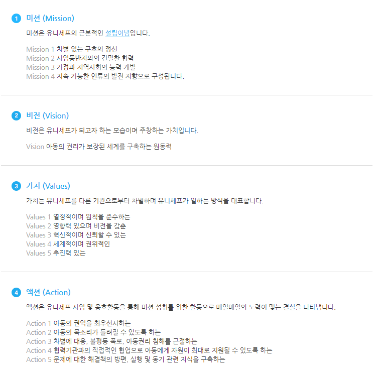 유니세프 브랜드의 힘은 더 좋은 세상을 구축하고자 하는 비전에 있으며 이러한 비전을 실현하는 역량에 있다고 말하며 유니세프가 주장하는 가치, 브랜드 아이덴티티는 기관을 대표하는 네 가지 요소 – 미션(Mission), 비전(Vision), 가치(Values)와 액션(Action)으로 이야기하고 있다.