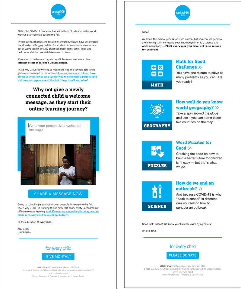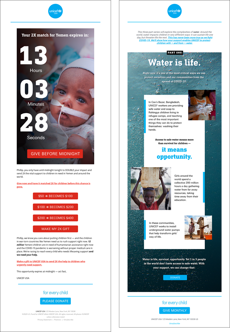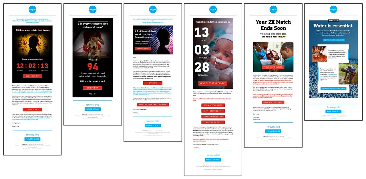 : 유니세프가 도움을 주려는 3가지 요소 메시지를 반복해서 레터를 발송한다.