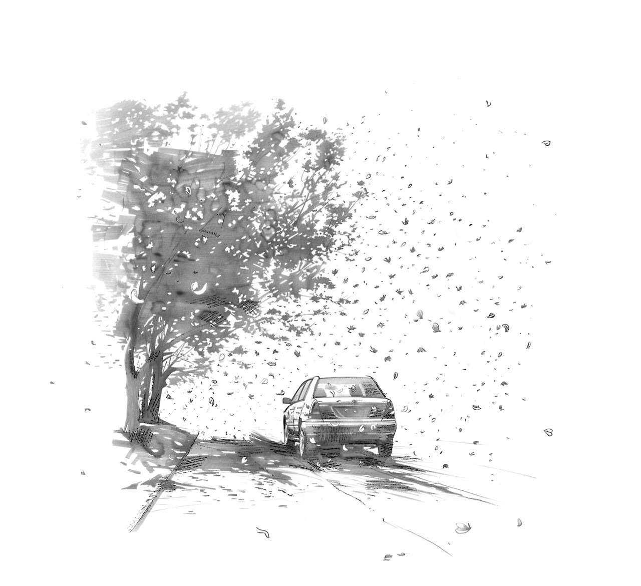 목적지를 향해 바쁘게 가던 어느 오후, 앞차에서 날리는 벚꽃잎들이 현실 같지 않은 장면을 연출했습니다. 내 앞에서 흩날리는 벚꽃잎은 아마 다음 봄에나 보겠지요. 이 순간이 지나가는 것이 아쉬워 그리게 된 오늘의 순간입니다.