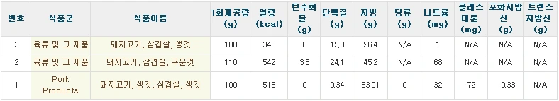 우리들이 즐겨 먹는 삼겹살의 경우 100g당 지방 함유량은 26.4g입니다. 200g만 먹어도 지방 50g이 넘습니다. (2번의 구운 삼겹살의 경우는 지방이 100g당 45.2g인데 아마 소금을 뿌려 구운 후 무게를 측정하였기 때문에 수분이 줄어든 상태의 베이컨과 유사한 상태라고 생각됩니다. 따라서 생것에 비해 지방의 함유량이 월등히 높은 것 같습니다.)