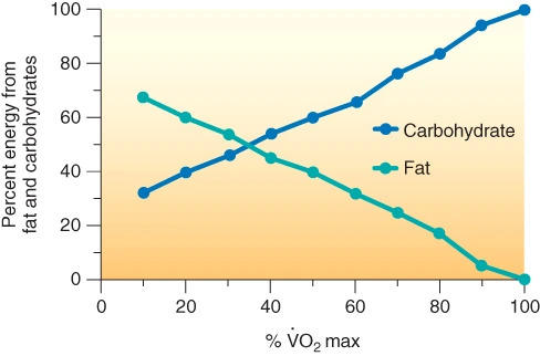 즉 지방과 탄수화물의 사용 비율은 서로 반비례 관계입니다. 지방의 에너지 사용 비율이 늘면 탄수화물의 사용 비율이 줄고, 탄수화물의 에너지 사용 비율이 늘면 지방의 에너지 사용 비율이 줄어듭니다. 그리고 지방과 탄수화물의 에너지 사용 비율은 운동 강도와 밀접한 관련이 있습니다.