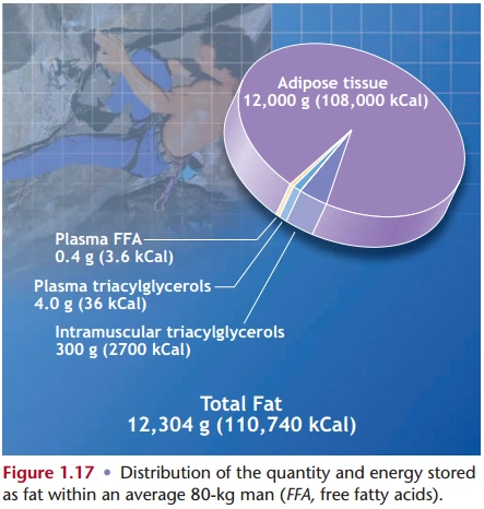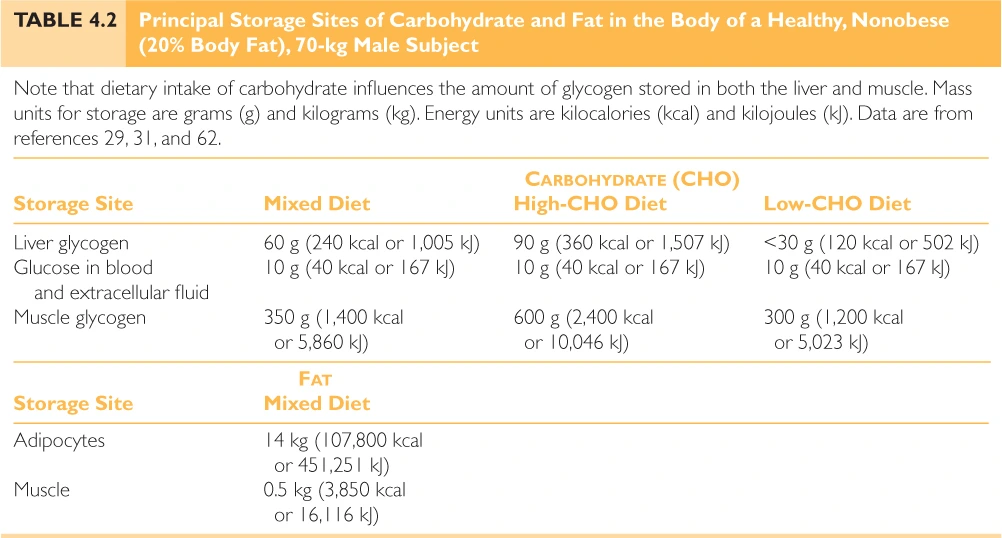 파워운동생리학 8판 표4.2 체중 70kg(체지방률 20%)인 건강한 남성의 탄수화물, 지방의 주요 저장 부위