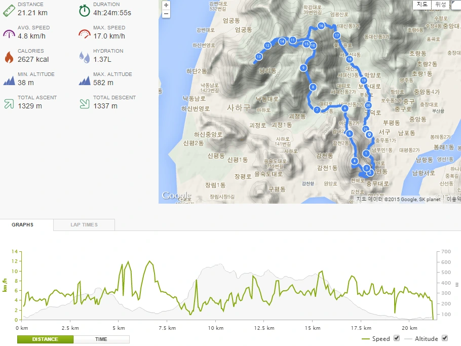 등산은 자주 다니던 코스인 천마산 - 시약산 - 구덕산 - 승학산 - 꽃마을 - 구덕운동장 - 집까지의 21km이고 시간은 4시간 25분이 걸렸습니다.