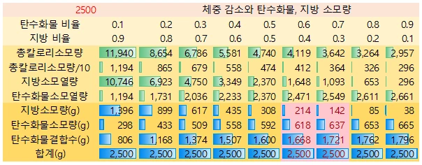 지방은 214g~142g, 탄수화물은 618g~637g, 수분은 1,668g~1,721g + 500g의 소모가 있었으며 총칼로리 소모량은 4,119kcal~3,642kcal 정도라고 볼 수 있습니다.