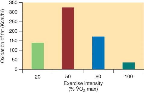 파워운동생리학 8판 그림 4.12 일반인이 다양한 운동강도에서 사용하는 지방대사 비율