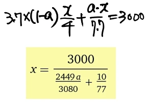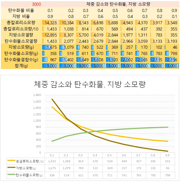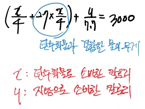 그래서 처음 만들었던 수식에 탄수화물과 지방의 반비례 관계를 덧붙여 계산식을 만들면 다음과 같습니다.