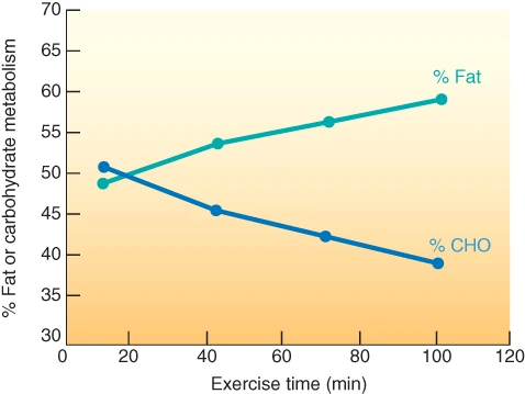 그리고 운동 중 지방과 탄수화물의 에너지 비율은 다음과 같습니다.