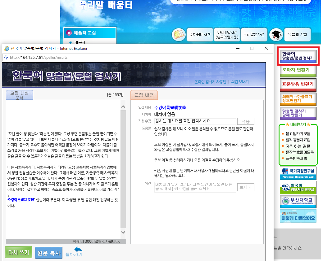 한글과 우리말 배움터에서 맞춤법을 알려주지만, 문맥의 흐름과 시의적절한 단어 선택까지 봐주는 것은 아니다.