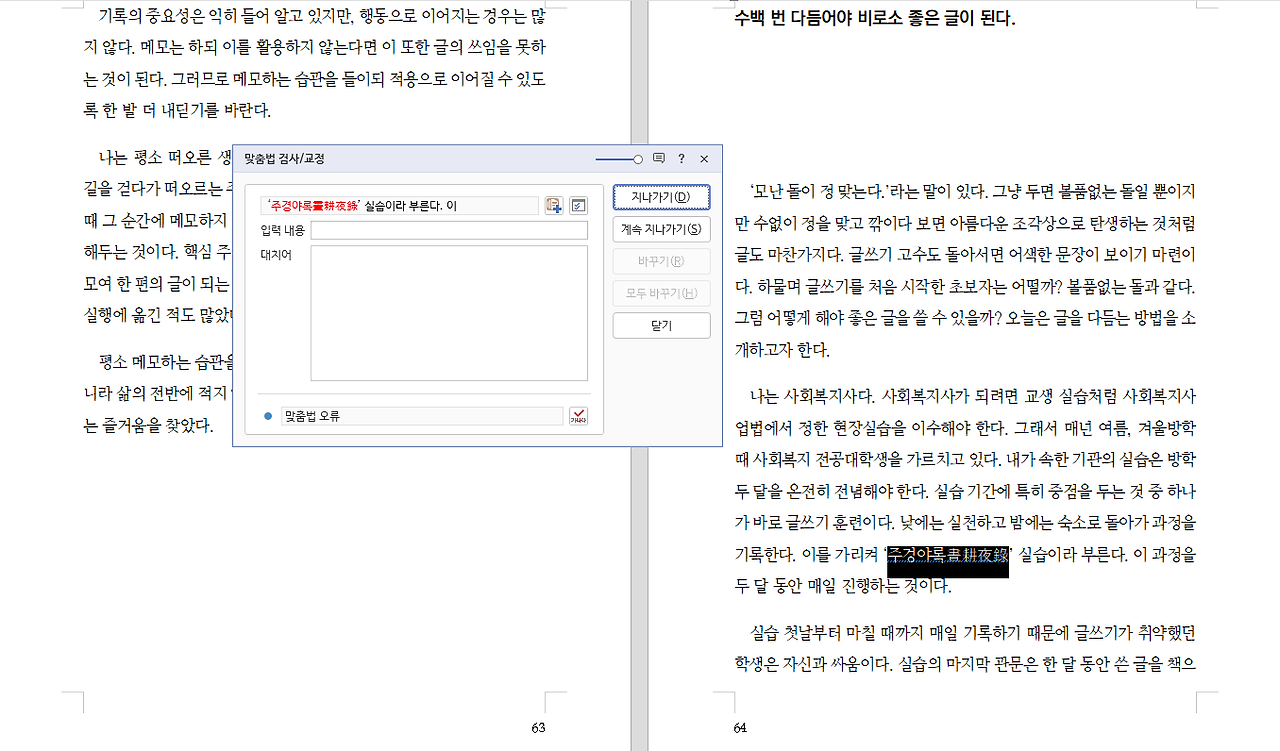 한글에서 교정한 글을 국립국어원 우리말 배움터에서 2차로 검사한다. 우리말 배움터에 한국어 맞춤법/문법 검사기가 있다. 쓴 글을 복사해서 붙여 넣기만 하면 잘못된 표현을 콕 집어 알려준다. 어느 정도 글쓰기 수준이 오르면 한글만으로도 충분하다.