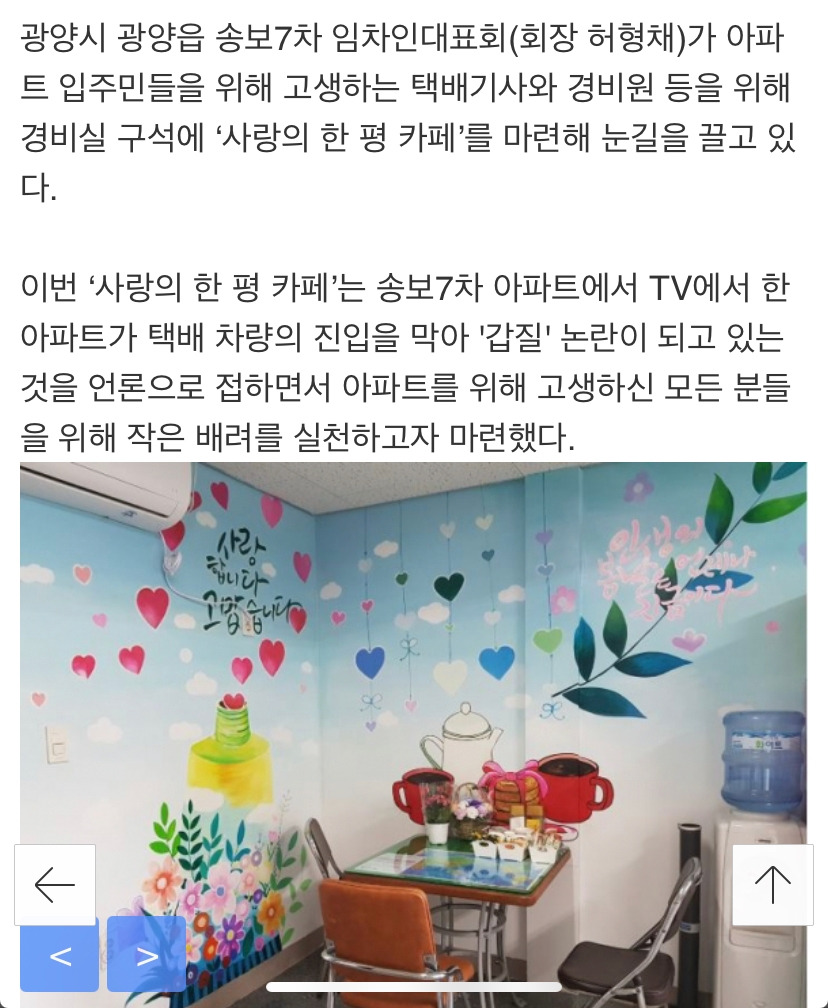 평 카페 소식이 언론에 소개되었다. 당시 모 아파트에서 택배차가 들어오지 못하게 했던 사건 때문이었다. 덕분에(?) 포털사이트 실시간 검색어와 메인을 장식하는 경험을 했다. 한 평 카페가 언론에 보도되자 더 많은 사람이 관심을 보였다. 아파트 주민은 물론이고 심지어 주민이 다니는 회사 사장님까지 커피와 다과를 보내주기도 했다. 직원이 사는 아파트에서 이렇게 좋은 일을 한다니 사장님까지 감동하게 만든 것이었다. 언론 보도 후 우리 집은 초인종은 한 달 넘게 쉴새 없이 울렸고 커피, 녹차, 종이컵, 빵, 고구마, 과일, 떡, 홍삼, 음료…. 사람들의 온정이 끊이질 않았다. 그렇게 들어온 차와 물품만 무려 6개월 넘게 내어놓을 수 있는 양이었다.