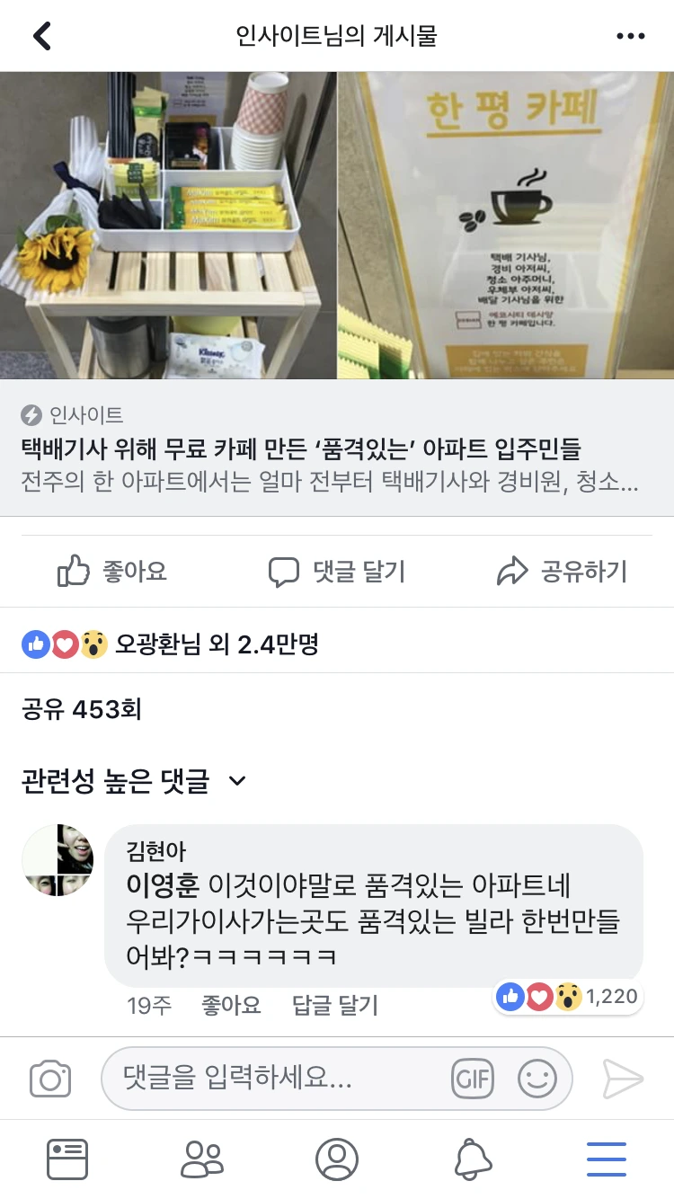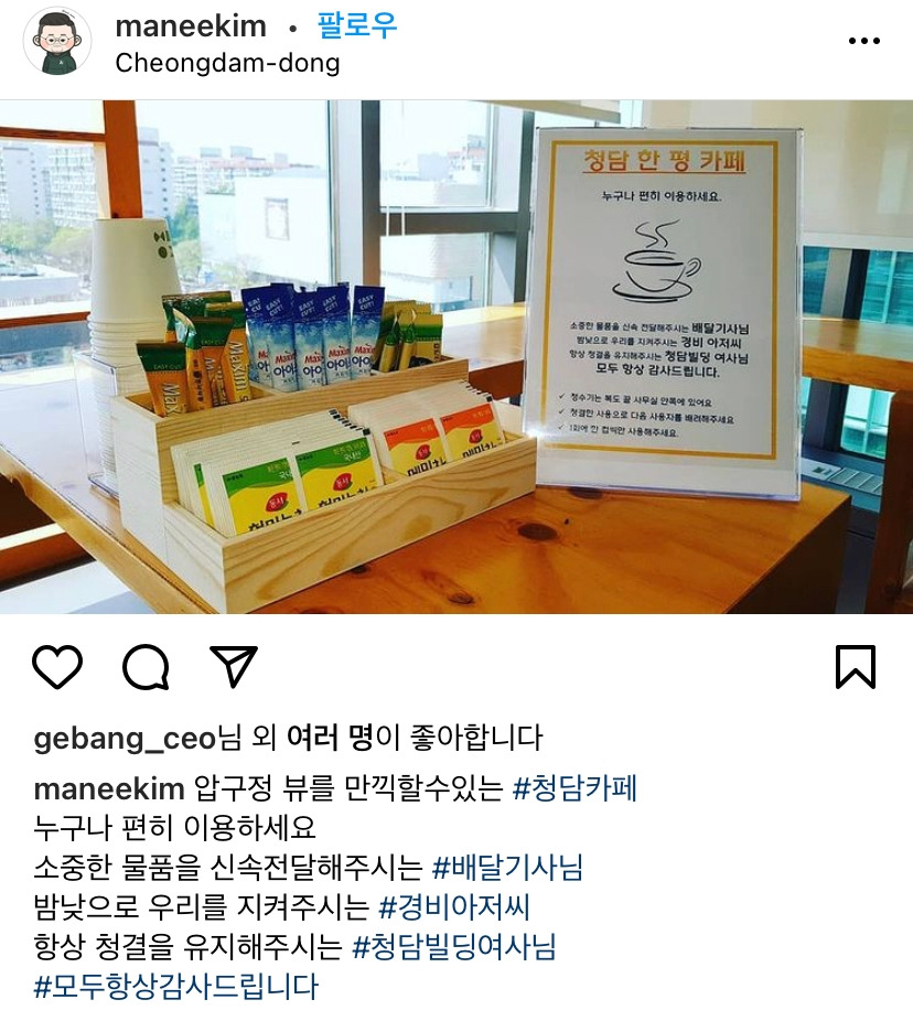 한 평 카페는 택배원, 경비원, 환경미화원처럼 아파트를 위해 애써주는 분들이 잠시나마 차 한 잔의 여유를 갖길 바라는 마음으로 시작했다. 그리고 티테이블 하단에 ‘나눔박스’를 만들어 집에 있는 커피와 간식을 나눌 수 있도록 했다. 주민들 누구나 부담 없이 할 수 있는 만큼 동참할 수 있도록 만든 것이다. 한 평 카페를 놓아둔 다음 날, 입주민 카페에 글이 올라왔다. 누군가 사진을 찍어 올린 것이다. 소식을 접한 주민들은 정말 좋은 일이라며 각자의 방식으로 나눔에 동참하기 시작했다. 우리 집만 하는 것이 아니라 주민들이 함께 만들어 가는 공간이길 바랐는데, 한 평 카페 의미가 잘 전달된 것 같아 고마웠다. 주민들은 고마움을 표현하고 싶었는데 방법을 몰랐다며 이렇게 참여할 수 있게 해줘서 고맙다며 응원하는 댓글이 많았다.