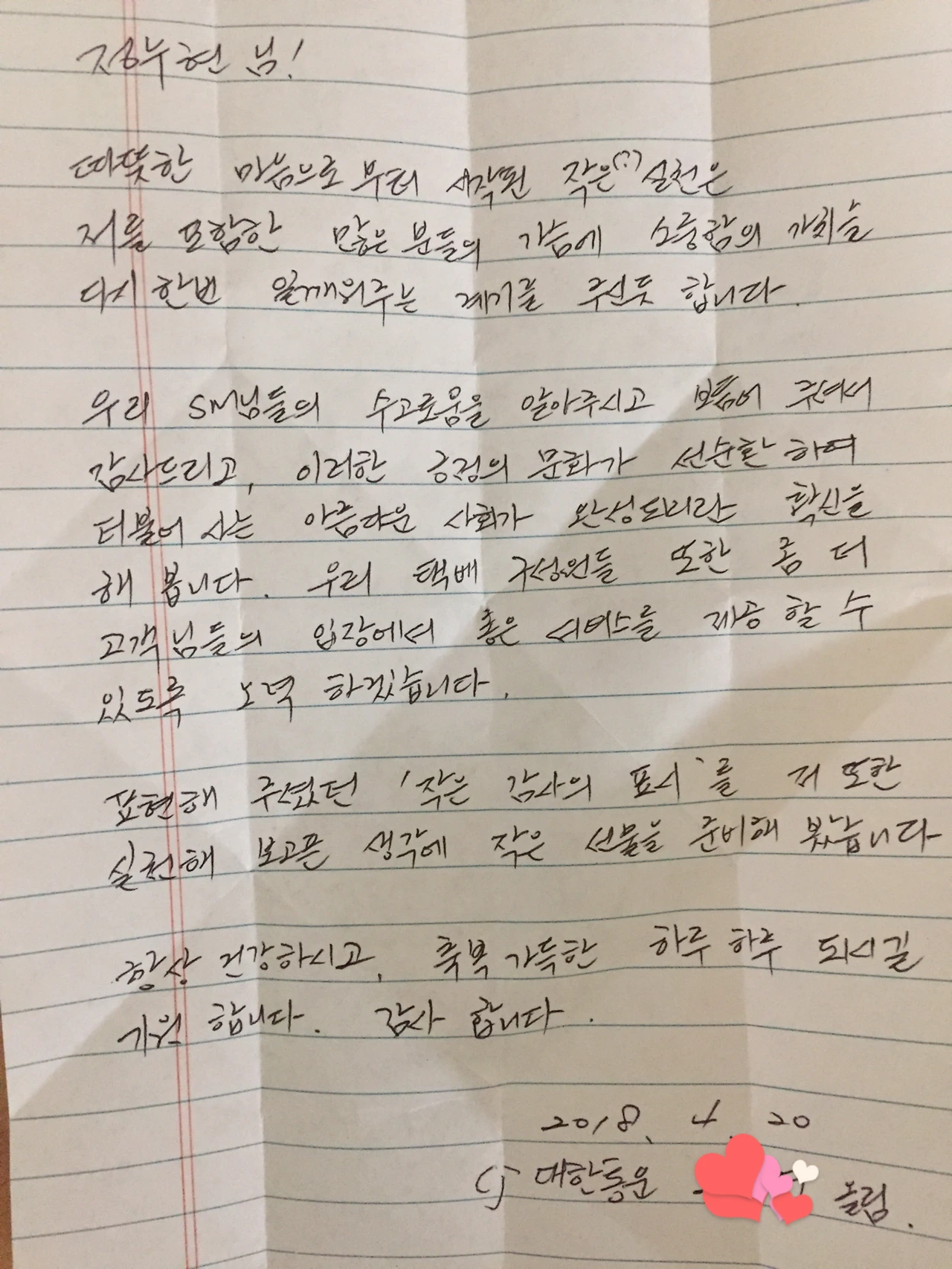 한 평 카페를 운영하면서 여러 에피소드가 있었다. 그중 몇 가지 일화를 소개하고 싶다. 하나는 택배 기사님이 소속된 회사에 직원이 보낸 편지와 선물이었다. 그가 보낸 편지 내용은 이러했다. 『따뜻한 마음으로 시작된 작은 실천이 많은 이들에게 소중함을 일깨워 주었으며, 택배원의 수고를 알아준 것에 대한 고마움과 더 좋은 서비스로 주민들에게 보답하겠다는 것』이었다.