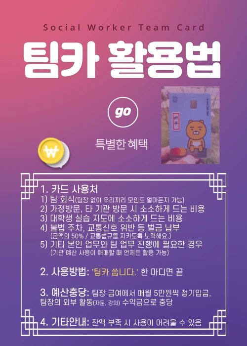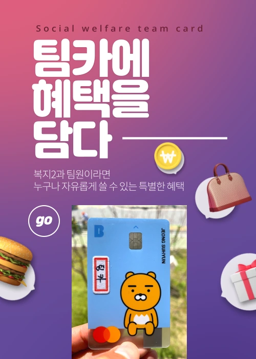 팀카는 오직 팀원을 위한 카드이며, 복지2과 팀원이라면 누구나 자유롭게 쓸 수 있습니다.