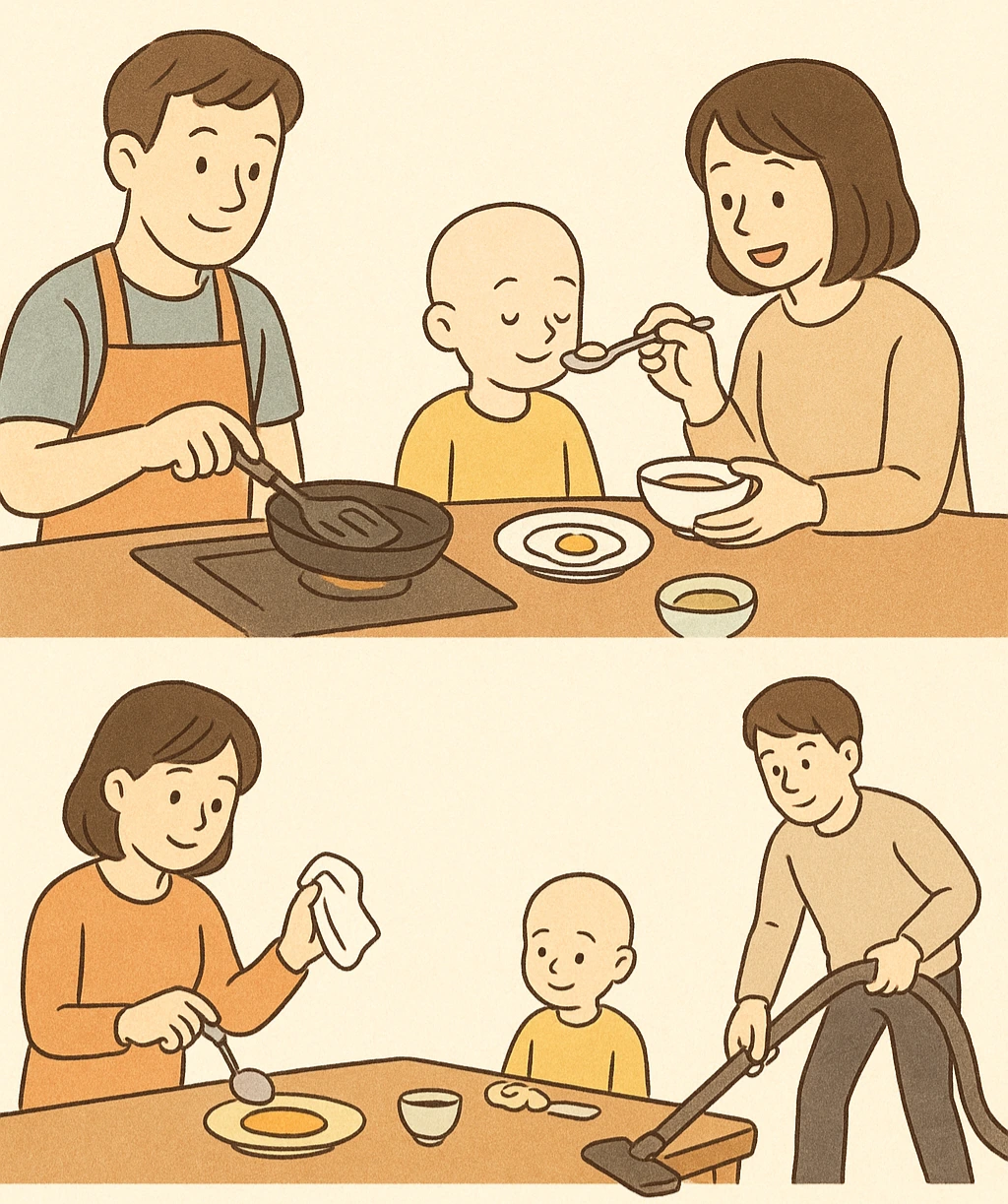 계란 프라이로 엄마 아빠는 얼른 배를 채우고