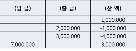 이번에는 반대로 7백만 원을 입금할 경우 잔액은 3,000,000이 돌아선다.