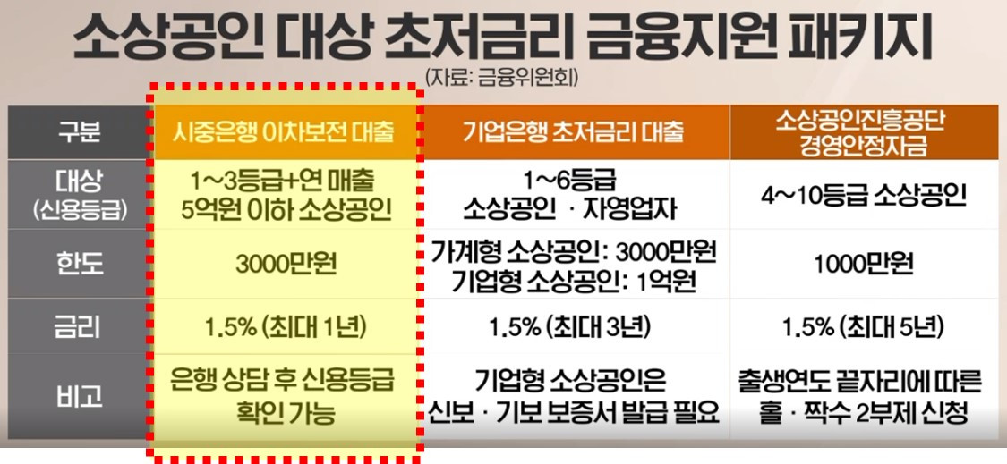 - 신용등급이 1~3 등급에 해당되고 연매출 5억 원 이하의 소상공인인 경우 시중은행 이차보전대출 대상에 포함된다.