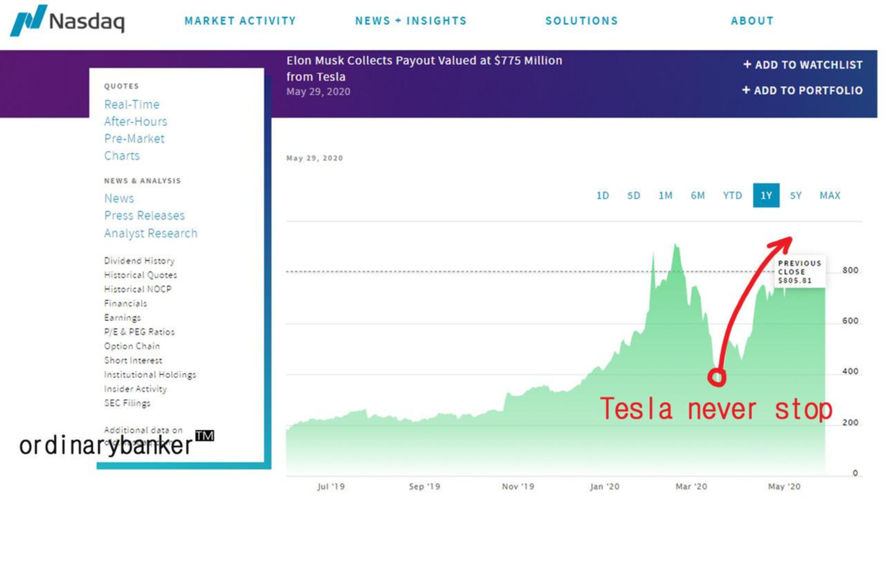 일론 머스크는 생방송 중 마리화나를 피우거나 트윗을 통해 테슬라의 주가가 너무 높다는 발언을 하는 등 예상치 못한 기행으로도 유명하다. 하지만, 코로나19도 여파에도 여전히 테슬라 차량 판매랑은 증가중이며 주가는 연일 강세를 띠고 있어 모든 비난을 종식시키는 것 같다.