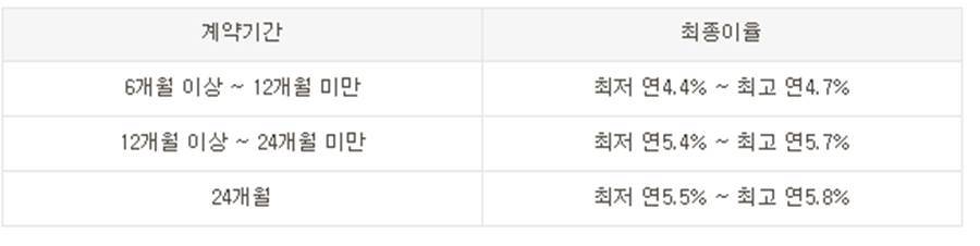 → 표 보는 방법 : 만기 12개월 가입 시 기본금리 4.4%, 급여(0.7%)와 S20(0.3%) 가입 시 5.4% 적용