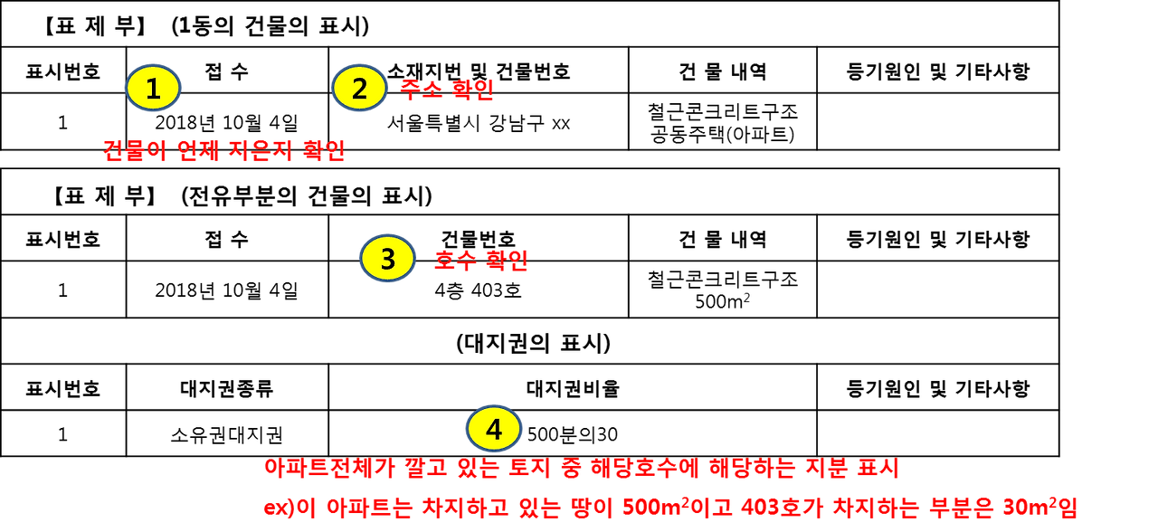 1) 표제부 : 부동산에 대한 기본정보가 담겨 있고 주소, 면적 등이 확인 가능하다.
