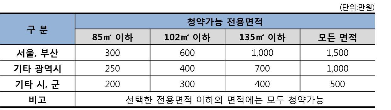 ② 현재 서울에 거주할 경우 300만 입급한 청약통장 보유시 135㎡주택을 청약하려면, 입주자모집공고일 전 추가로 차액 700만원을 입금하면된다.