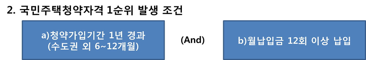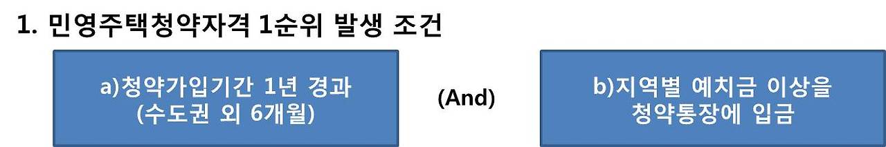 가입 후 일정 조건을 충족하면 1순위로 청약할 수 있는 권리가 생기는데, 위에서 설명한 민영주택과 국민주택에 따라 각각 조건이 다르다.