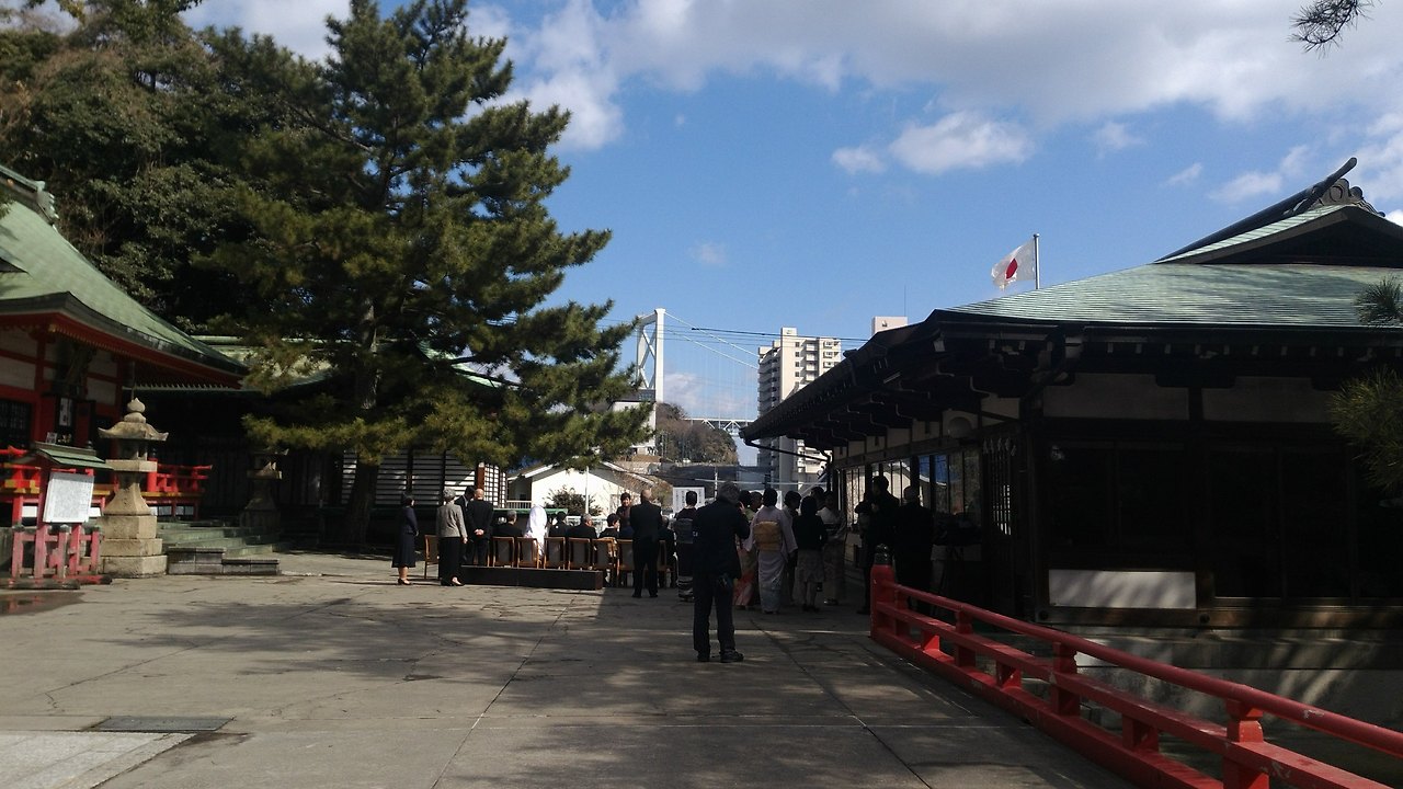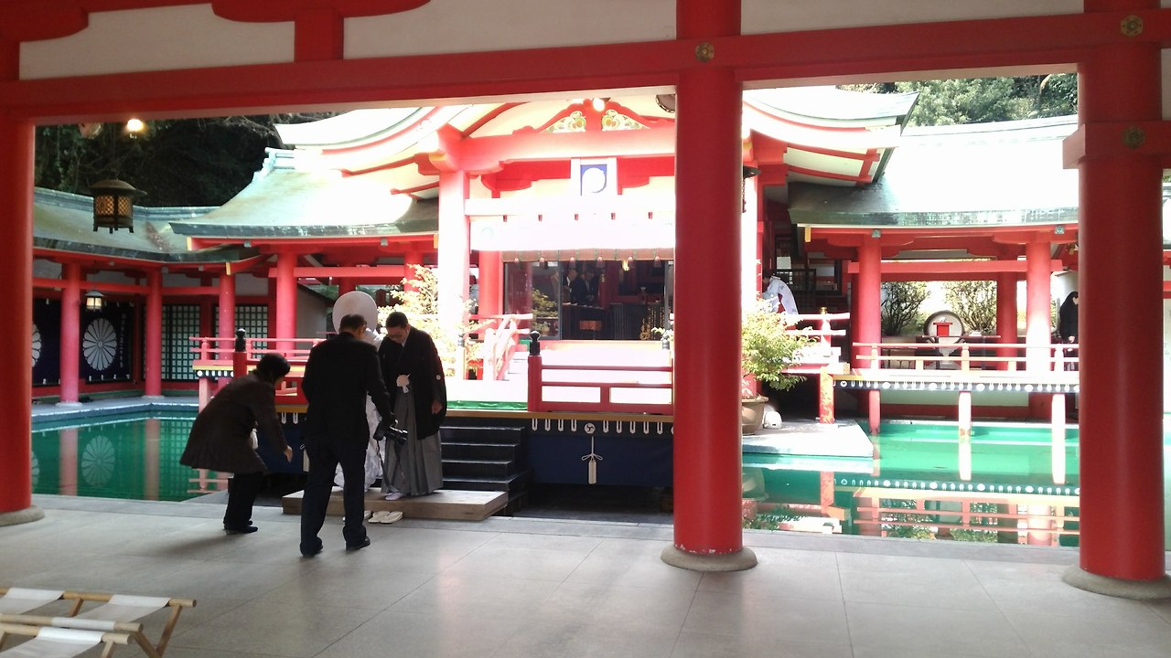 시내 쪽으로 가다 보면 신사 하나가 나온다. 아카마 신궁. 이름 그대로 빨갛다. 잠깐 들려서 뭐 하나 보니 결혼식 중. 관광객과 하객이 아무렇지 않게 섞여 있다.