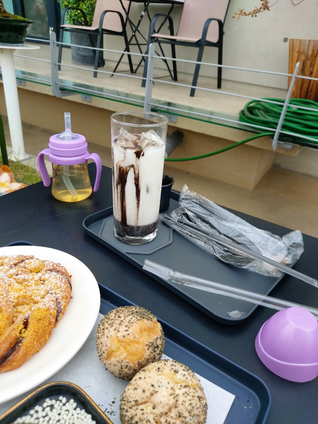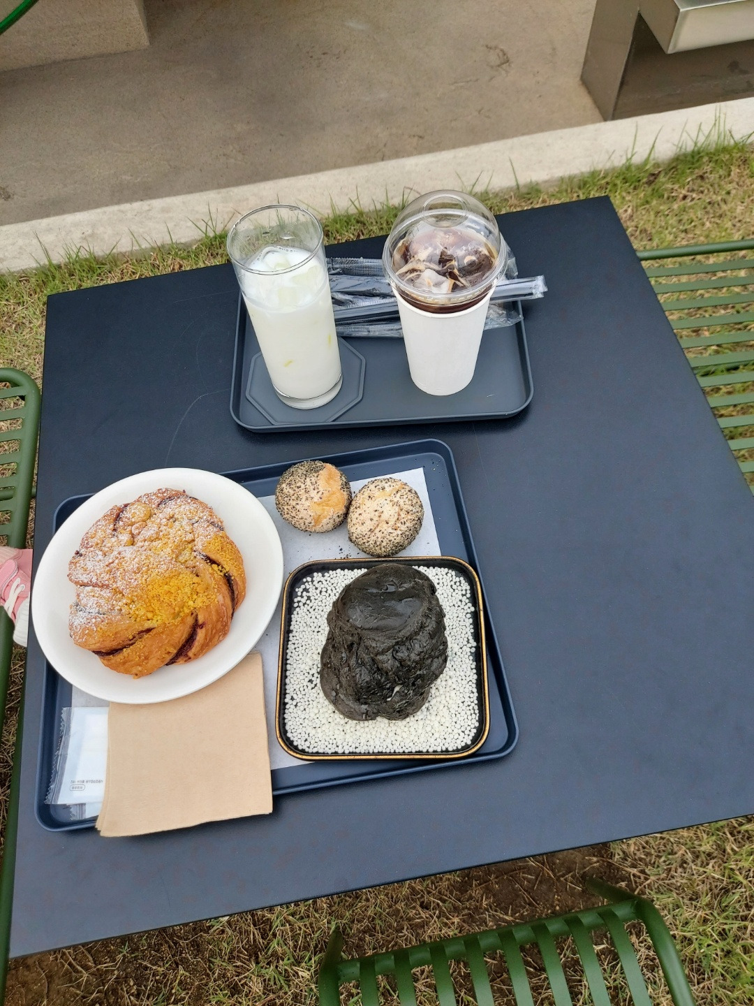 시그니쳐 메뉴가 카페 컨셉에 맞게 수석 모양의 크림 슈였다. 시그니쳐는 또 확인을 해 봐야 하기에 음료와 함께 세트로 묶여 있는 메뉴 하나와 카페 음료의 전반적인 질을 확인할 수 있는 아메리카노를 시켰다. 추가로 대충 저녁 시간이 돼서 적당히 저녁으로 때울 수 있게 빵 한 두어 개를 더 주문했다. 넓은 발코니 개념의 실외 공간에 평상 느낌으로 꾸며진 자리가 있어 아이와 앉아서 먹으면 좋을 것 같아 자리를 잡았다.