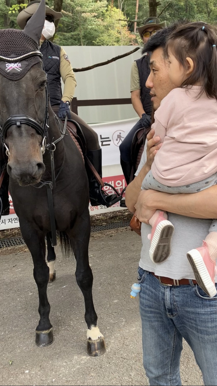 그런 말이 눈앞에 있다니! 우리뿐만 아니라 많은 사람들이 모여들었다. 홍보 목적이 맞는지 사진을 찍을 수도 있었고, 조심스레 다가가 관리자 분에게 물어보니 만져도 된다고 했다. 아이를 안고 말 옆으로 가서 사진을 찍고 말의 콧등과 볼을 살며시 만져 봤다. 평소에 기회가 되고 상황이 허락된다면 말 목을 한 번 안아 보고 싶었는데 그걸 부탁할 수는 없는 노릇이고 아이보다도 내가 더 신기해서 옆에서 떠나질 못하고 연신 콧등과 볼만 조심스럽게 만졌다. 정말 멋있는 동물이다. 눈이 정말 커다란 유리구슬 같았다.