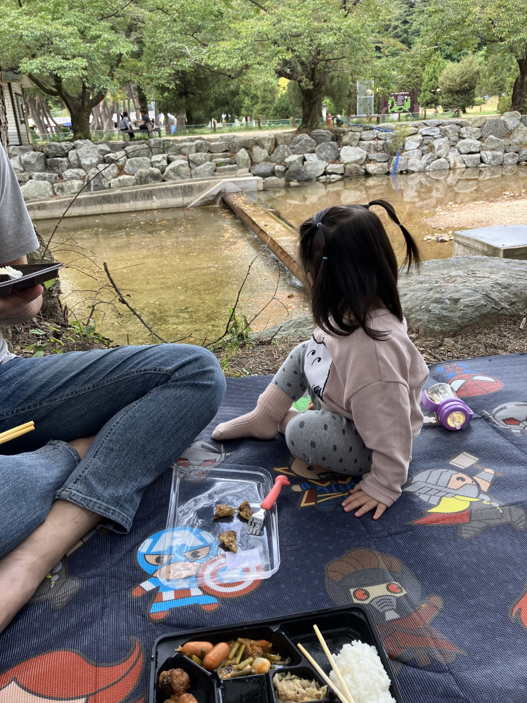 아이 밥을 꺼내고 사온 도시락을 먹기 시작했다. 밖에서 먹는 밥은 그 맛이 거의 두 배는 되는 것 같다. 편의점 도시락이라 애초에 별 기대가 없었지만 나름 맛있게 먹었다. 아이도 기분이 좋은지 엄마, 아빠가 주는 대로 곧잘 받아먹었다. 밥을 먹으며 앞에 천을 바라보니 몇몇 아이들이 이제는 물이 찰 텐데 종아리 정도만 젖는 정도로 해서 물놀이를 하고 있었다. 몇몇은 물고기 잡는 도구를 이용해 물고기도 잡고 있었다.