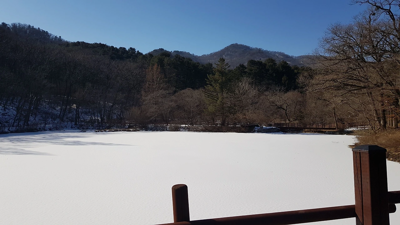 광릉수목원 내 호수인 육림호 (왼쪽은 얼어서 눈이 쌓인 육림호, 오른쪽은 여름의 육림호)