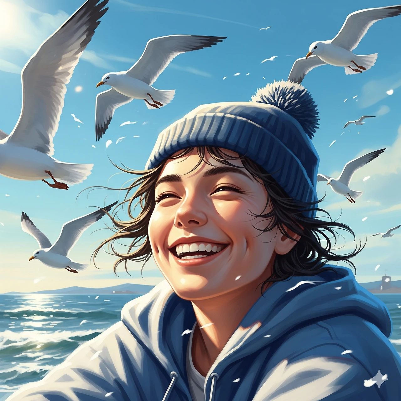 갈매기들도 네가 행복하니 신이 나 춤을 추고시원하고 상쾌한 물바람 쏘이고