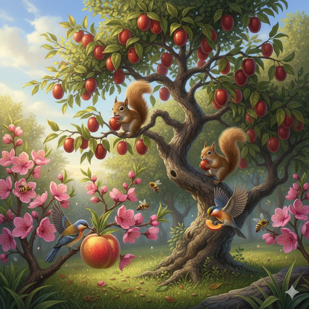 대추나무의 대추들이 익어가면 갈수록사방을 두리번거렸던 다람쥐 한쌍잘 익은 대추를 입에 물고 달아난다네복숭아꽃이 피면 벌들이 찾아오고열매를 맺고 자라 자아알 익노라면새들과 다람쥐가 주인인양 먹어치운다네