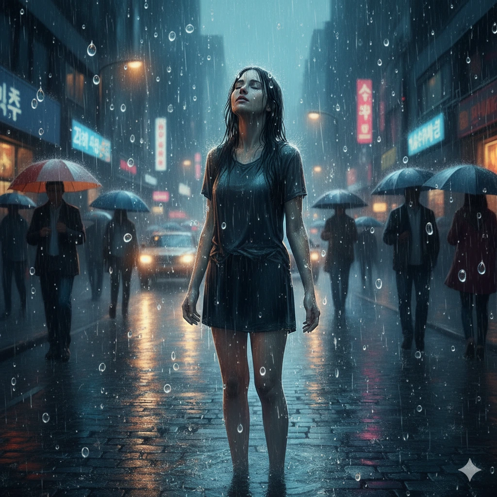 빗속에 서 있다.