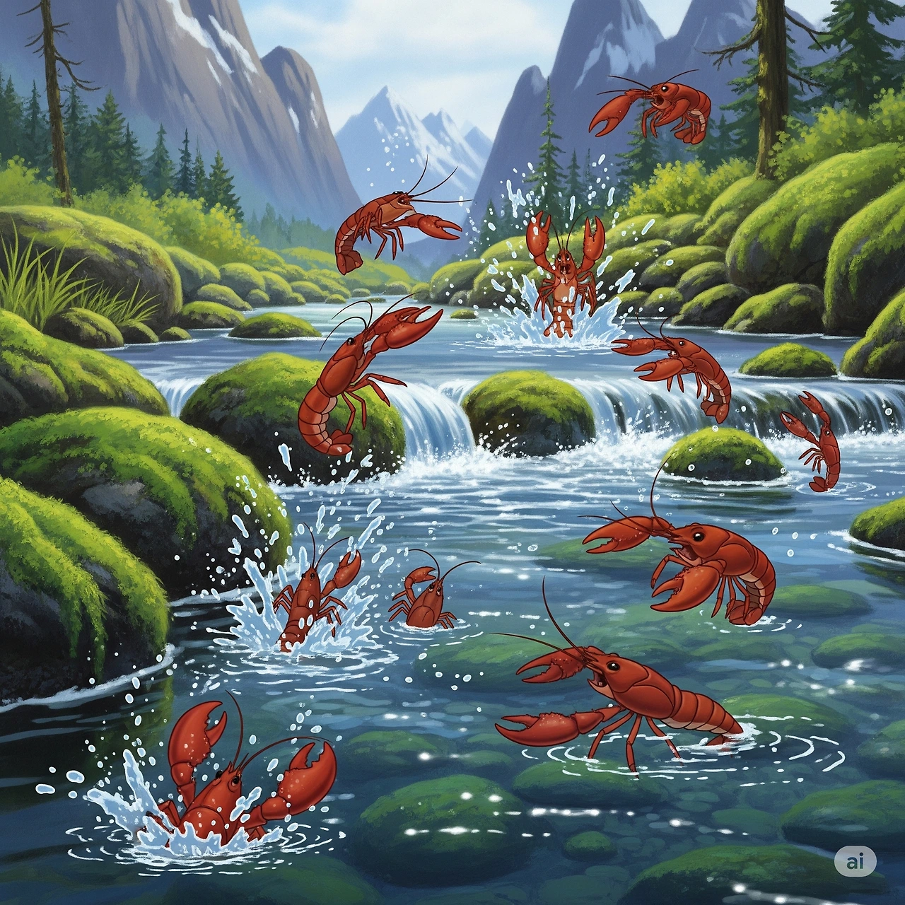 A stream winds through the very deep mountains, and crawfish leap.